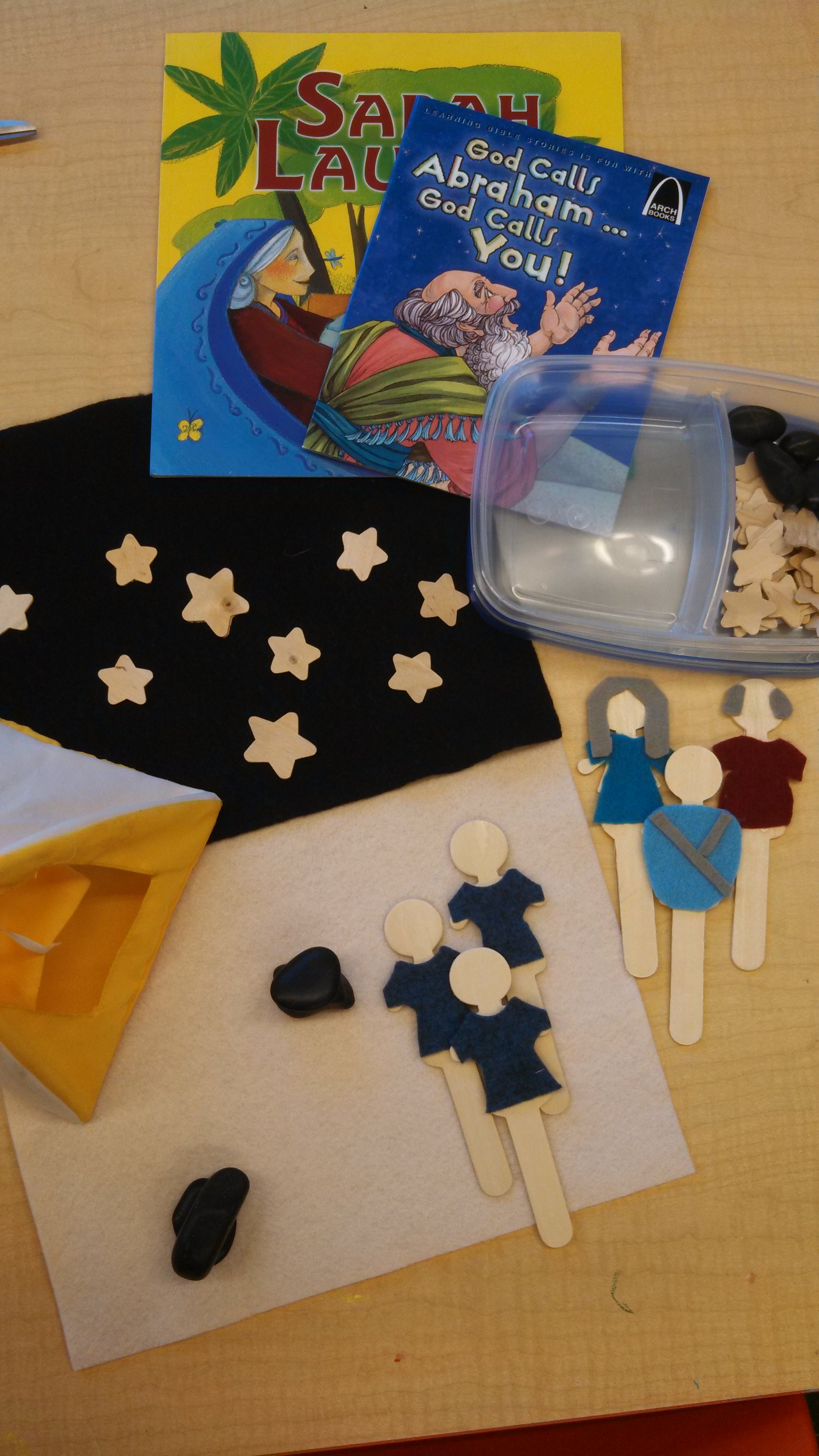 Wooden stars, black felt for night. Stones to make and altar with, wooden figures of Abraham, Sarah and baby Isaac.