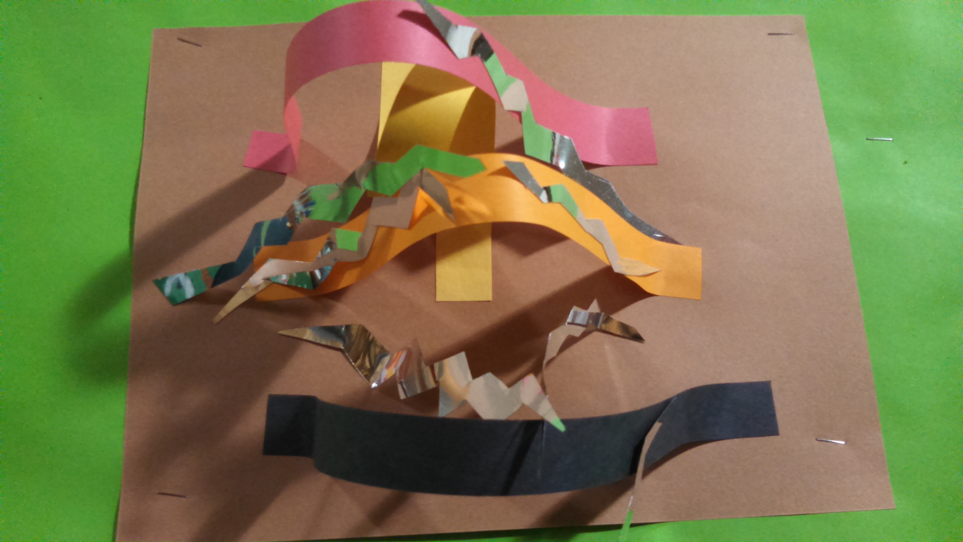In the past, I have used this 3d paper strip technique in kindergarten classrooms for wind and waves. Changing the color of the strips from blues and grays (waves) to reds, oranges and grey (smoke and fire) gave the project a whole new feel. The silver mirrored lightning bolts were made from a scrap we had in the bin. I love it when “old” ideas get transformed into something new!