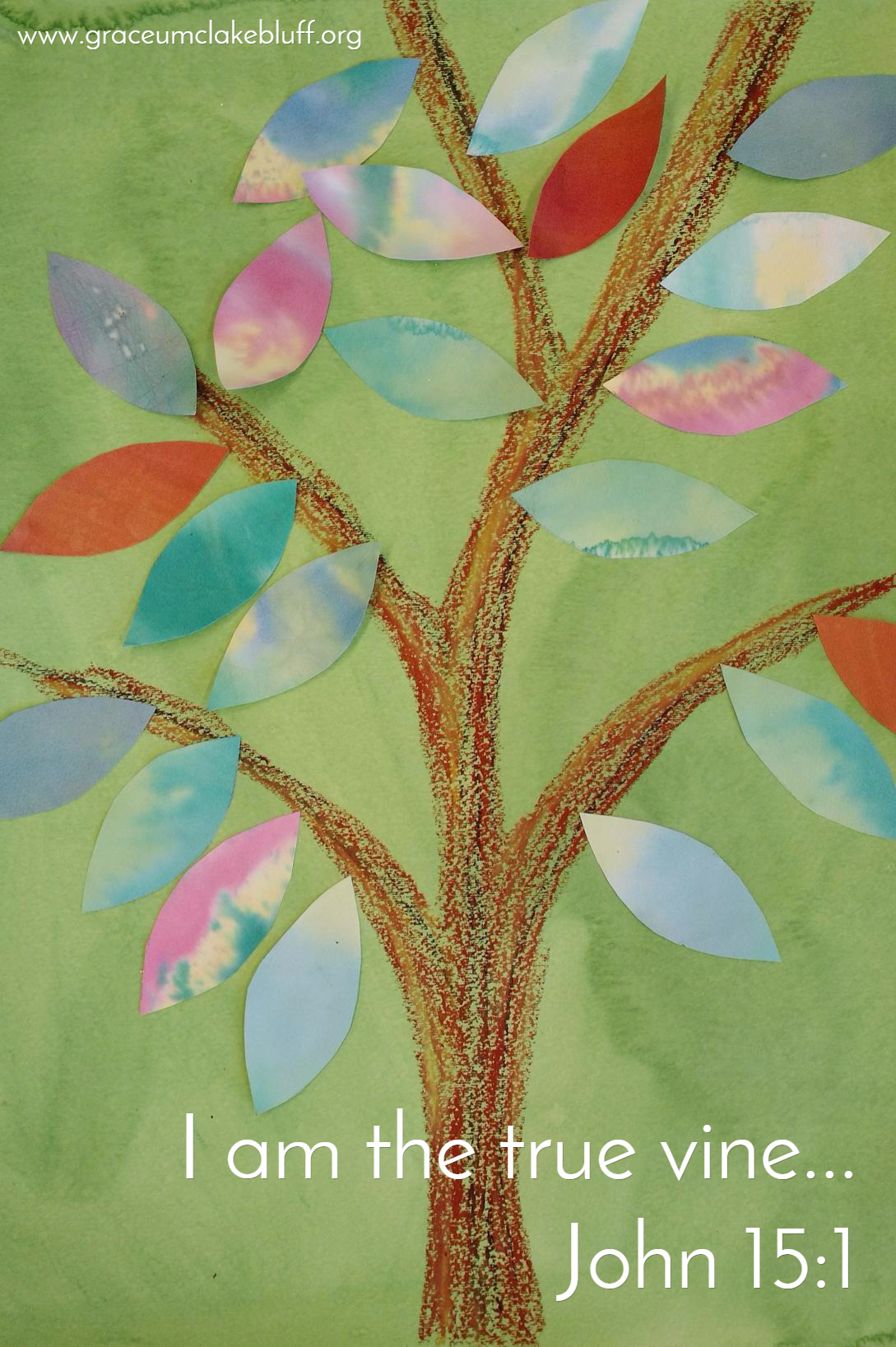 Since it was communion Sunday our class time was short. Our response was creating a group art project representing the true vine. The leaves were pre-cut from watercolor papers the children had created the weeks before. They glued them onto the vine.