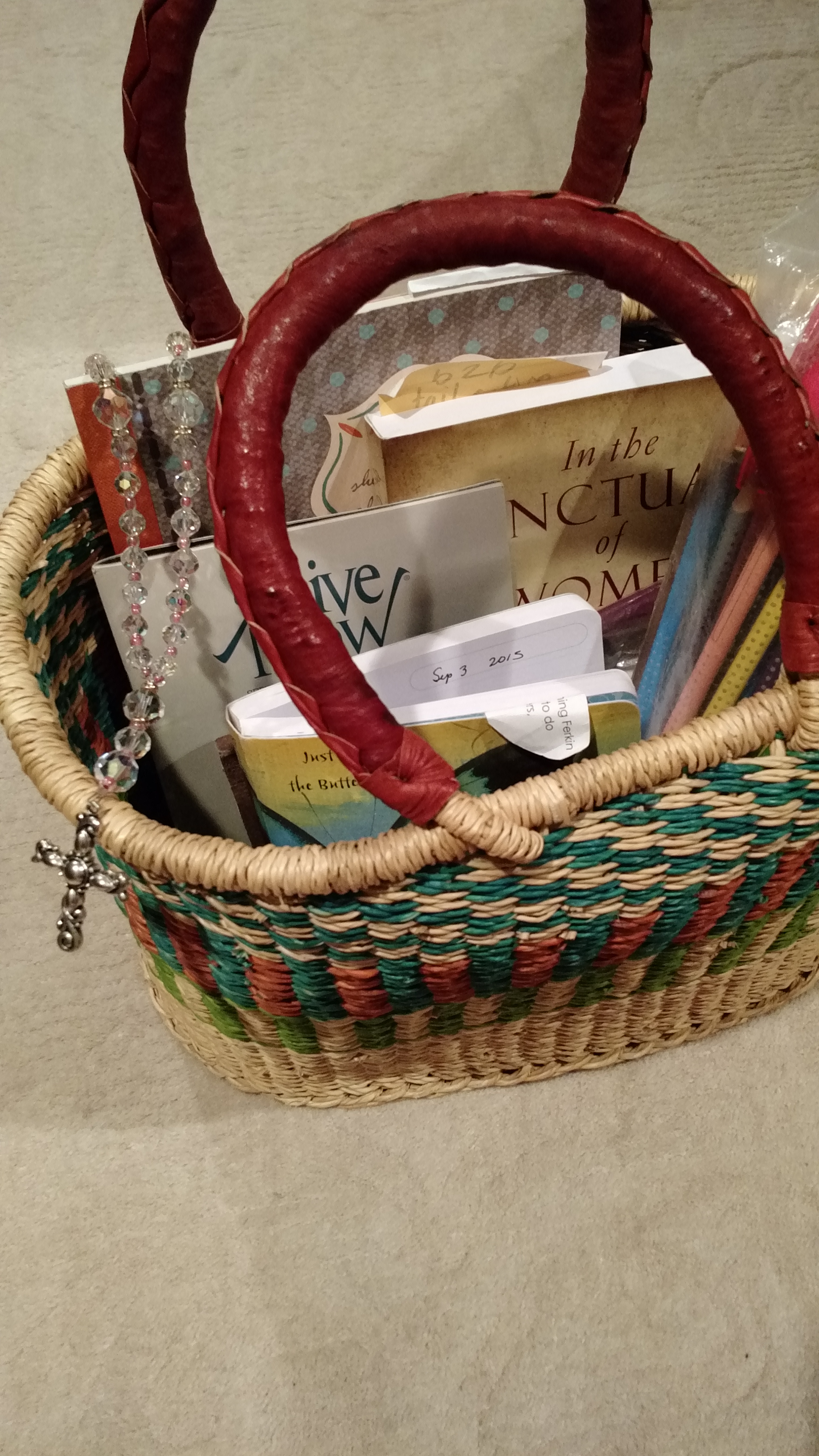 The peaceful, little pond by my home and the blank page are where I have been putting down some of the feelings. Spiritual practices of prayer, quiet, creative expression and breathing are helping. So, I have made my new basket a portable little sanctuary to carry along with me to the pond, carpool, or anywhere. The basket is not just for when things get overwhelming, but an everyday, visible reminder to practice thanking God for the gifts of compassion, strength to face the messiness of life, and the promise to pick up the burdens that are not mine to bear.