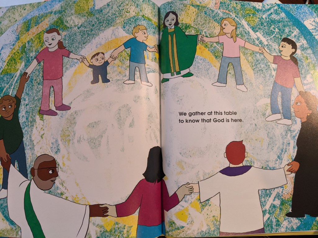 On the last page there is an image of people gathered in a circle with ephemeral swirls to remind us that the table extends across space and time. I asked the children gathered online, all of us separated in our own home with bits of bread and juice waiting before us, who was at the table with us today. They named Jesus and relatives far away. They spoke about their church family being online together. They got it. I was teary with gratitude for this sacred conversation in such a disconnected time.