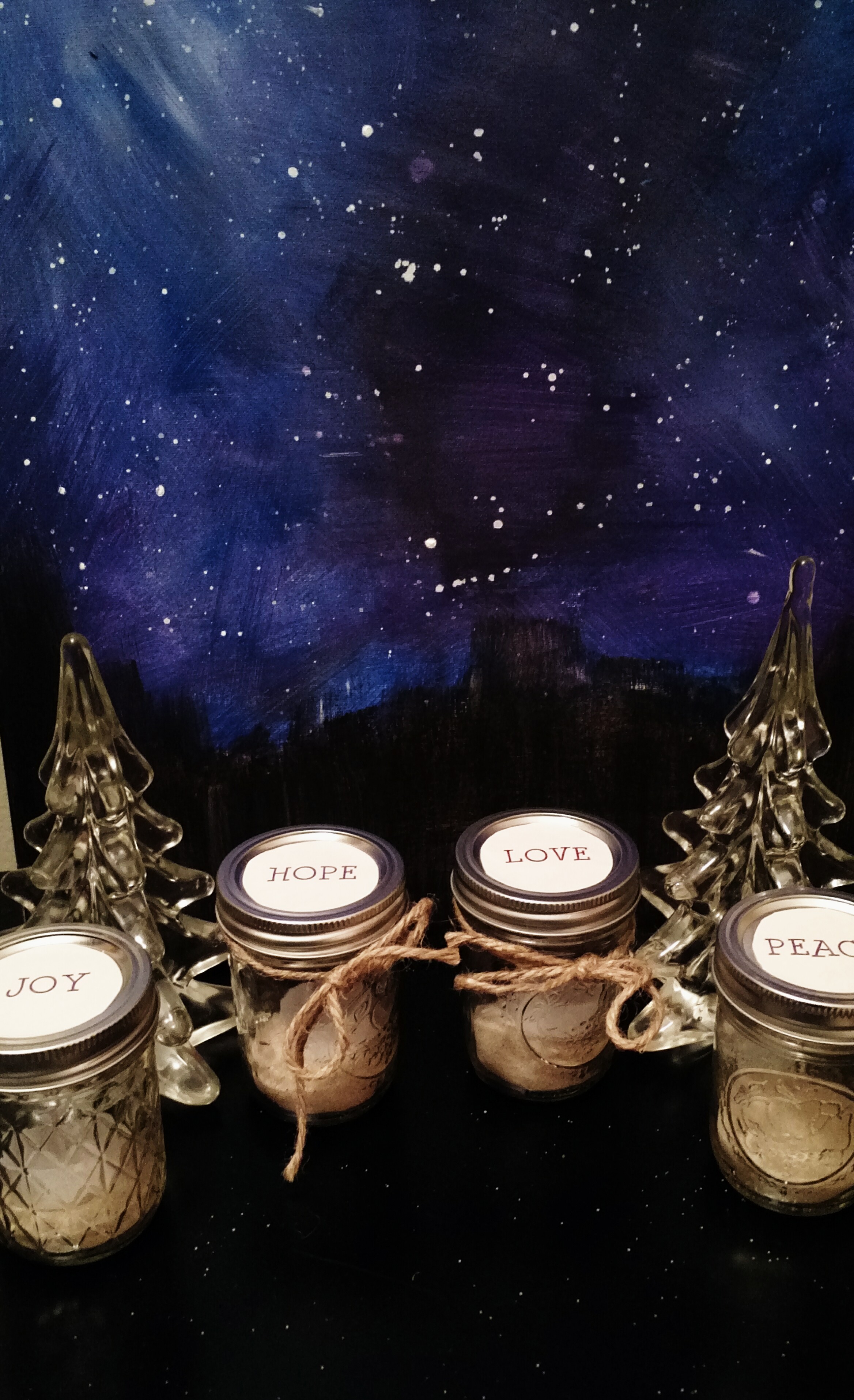 - Small mason jars and candles that we will use to create a “wreath” while gathered online. Click here for downloadable sticker labels.