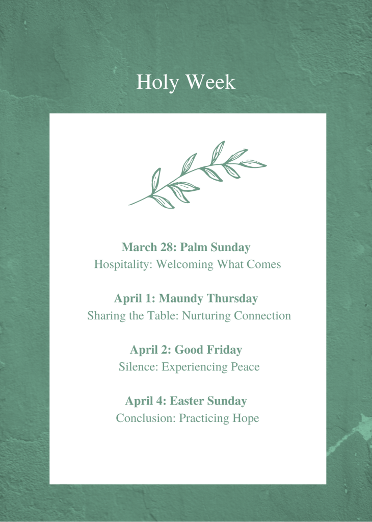 - March 28: Palm Sunday – Hospitality: Welcoming What Comes